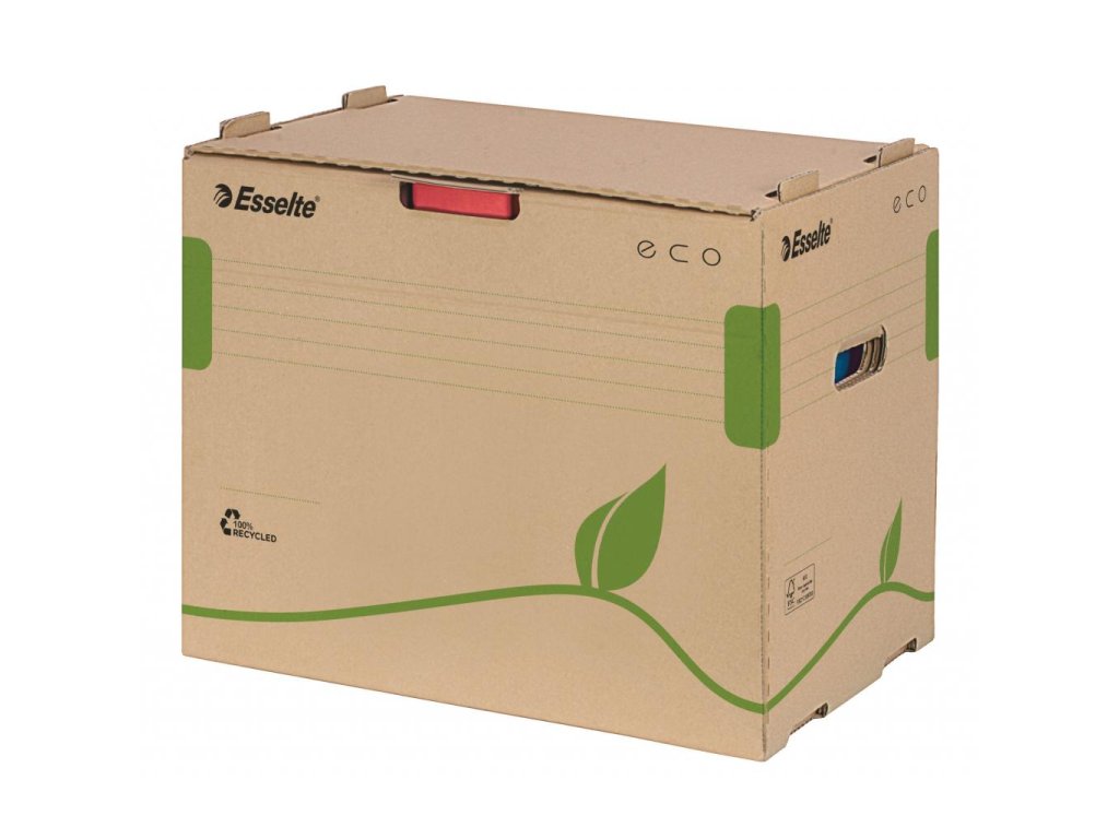 Krabica z archivačného systému Esselte ECO navrhnutá so zeleným prístupom. 100% recyklovateľná s 85% podielom spotrebiteľského odpadu, certifikovaná FSC. Veľkosť optimalizovaná iba na papiere A4 s cieľom minimalizovať odpad pri výrobe.Rozmery (š x v x h): 305 x 343 x 427 mm
