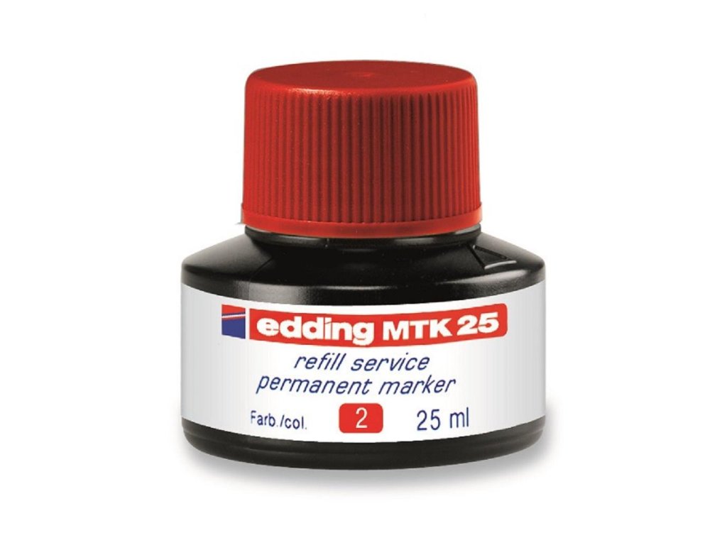 Atrament slabého zápachu s kapilárnym systémom na dopĺňanie permanentných popisovačov edding 2000/-2000 C, 2200/-2200 C, 400, 300, 330 a 370. Obsah 25 ml. Tento chemický prípravok je nebezpečný. Pri dopĺňaní vložte prednú časť popisovača špičkou do fľaštičky a po niekoľkých minútach bude popisovač pripravený k opätovnému použitiu. Obsah 25 ml.Farba: červená