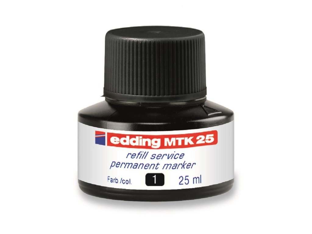 Atrament slabého zápachu s kapilárnym systémom na dopĺňanie permanentných popisovačov edding 2000/-2000 C, 2200/-2200 C, 400, 300, 330 a 370. Obsah 25 ml. Tento chemický prípravok je nebezpečný. Pri dopĺňaní vložte prednú časť popisovača špičkou do fľaštičky a po niekoľkých minútach bude popisovač pripravený k opätovnému použitiu. Obsah 25 ml.Farba: čierna