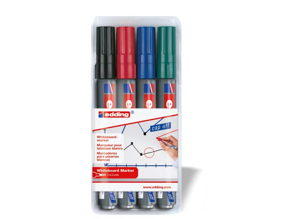 Popisovač na biele tabule, zasucha stierateľný. Plnený pigmentovým atramentom slabého zápachu bez prísady butylacetátu s vlastnosťou `Cap off`, zabraňujúcou vysychaniu atramentu pri otvorenom hrote aj niekoľko dní. Dopĺňateľný atramentom edding BT 30 alebo BTK 25. Hliníkové telo, vymeniteľný hrot. Hrot okrúhly, šírka stopy 1,5 - 3 mm. Dodávaný v sade 4 ks.Farba: mix 4 farieb