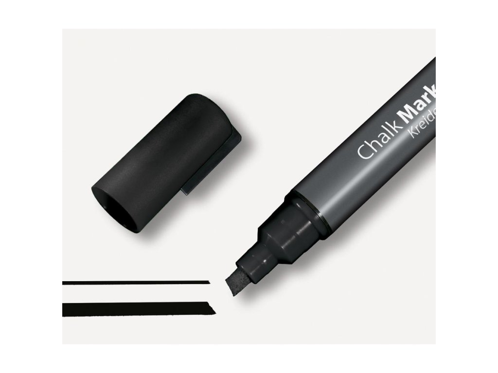 Ľahko stierateľné a vysoko nepriehľadné kriedové popisovače vhodné na sklenené tabule a všetky hladké povrchy podobné sklu. Zrezaný hrot hrúbky 1 - 5 mm. Vodeodolný atrament je zmazateľný vlhkou alebo suchou utierkou. Farba čierna.Dodatočné parametre
