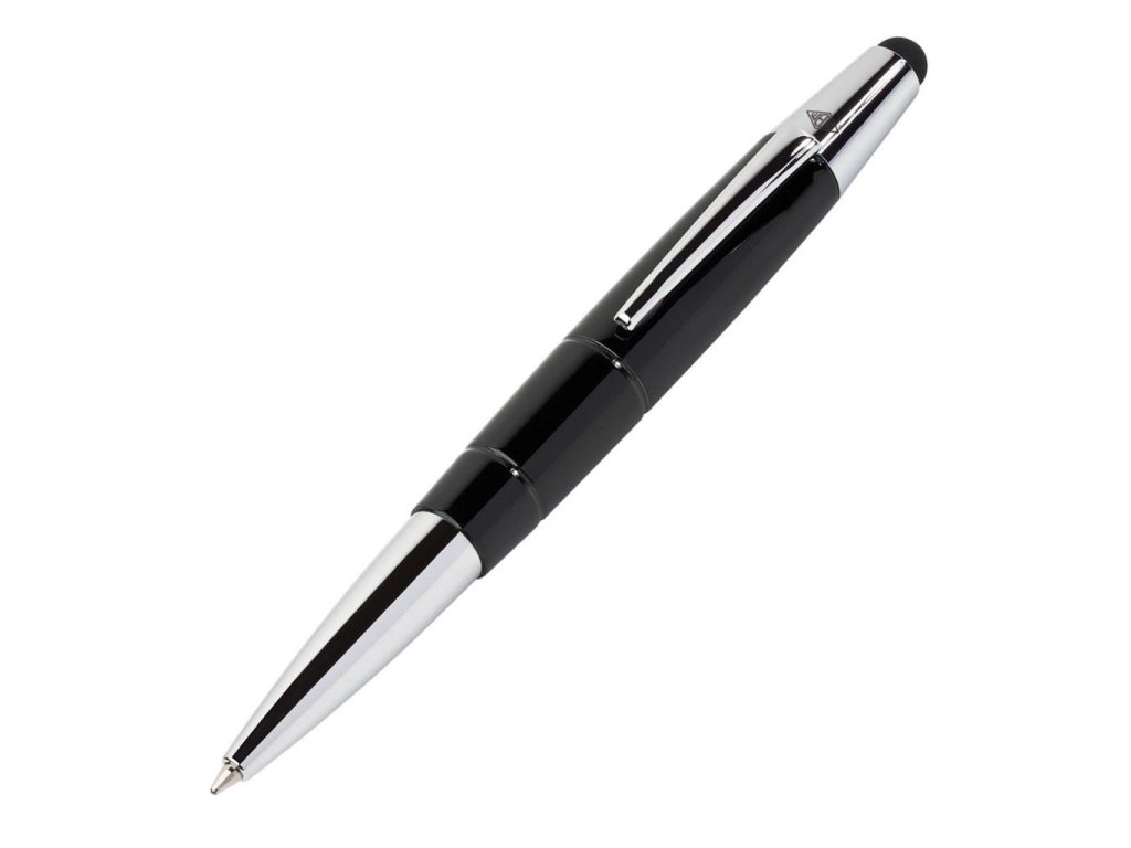 Guľôčkové pero s dotykovým zakončením v jednom, vhodné pre všetky malé telefóny, tablety, aj Apple iPhony a iPady. Ideálny spoločník na presnú navigáciu u všetkých typov dotykových obrazoviek. Jemný gumený hrot plne funkčný aj pri potiahnutí obrazovky ochrannou antireflexnou fóliou. Guľôčkové pero s klipom a veľkokapacitnou náplňou modrej farby (systém Parker). Vysokolesklé prevedenie doplnené chrómovými doplnkami..Farba pera: čierna