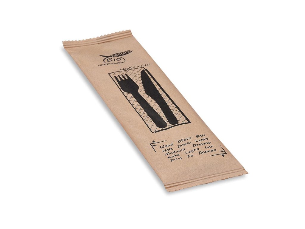 Hygienicky zabalená sada drevených príborov obsahuje nôž, vidličku a papierový obrúsok. Príbor má dĺžku 16,5 cm a je vyrobený z dreva. Papierový obrúsok má 2-vrstvy, rozmer 24x24cm, skladanie 1/8 a vyrobený je zo 100% celulózy. Príbor je vhodný pre studené a teplé jedlá do 100°C. Neobsahuje žiaden vosk ani lamináciu a má robustný dizajn.Balenie obsahuje 60 sád.