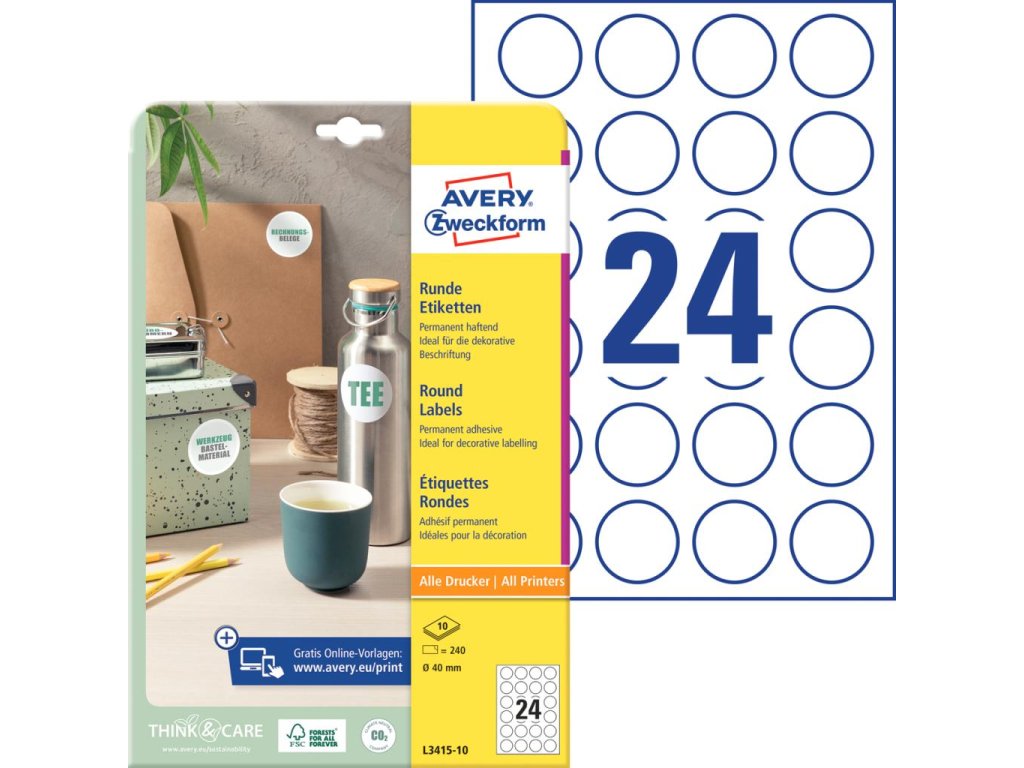 Etikety univerzálne kruhové 40mm Avery A4 10 hárkov