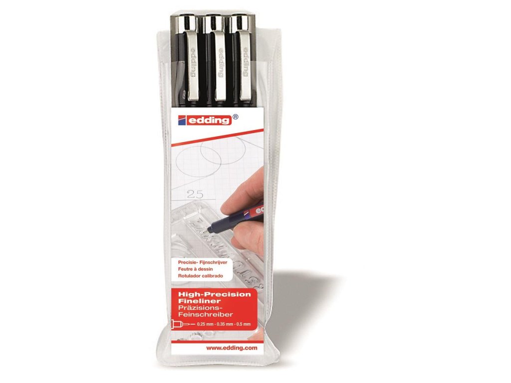 Špeciálny jednorazový popisovač s vláknitým hrotom, kovovým klipom a uzáverom je určený na kreslenie, náčrty, technické kreslenie a pod. Plnený vo vode rozpustným atramentom, ktorý na svetle nebledne. Farba čierna. Balenie sada 3 ks po jednom v hrúbkach 0,1 / 0,3 / 0,5 mm.Farba: čierna