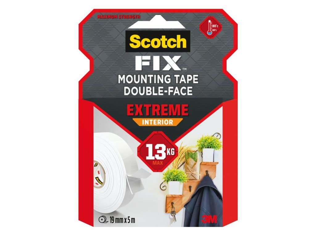 Supersilná montážna páska Scotch-Fix™ do interiéru s pokročilou technológiou 3M™. Táto vysoko kvalitná, prispôsobivá permanentná páska s nosnosťou do 13 kg je určená na extrémne použitie v interiéri a ako jediná montážna páska je vhodná aj na plasty, vrátane tvrdých plastov, ako napríklad PP a PE. Taktiež je ideálna na kovy, hladké a lakované/maľované povrchy a drevo. Rozmery 19 mm × 5 m.Dodatočné parametre