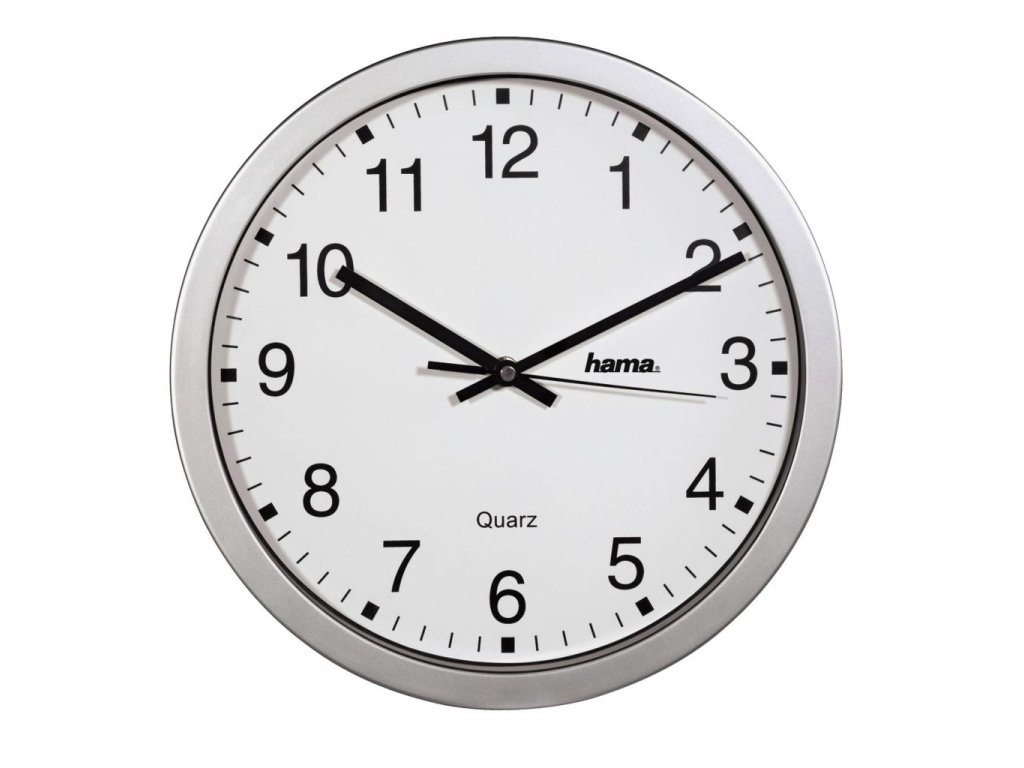 Quartz hodiny s analógovým zobrazením času. Veľký biely ciferník s arabskými číslicami a sekundovou ručičkou, hmotnosť 520 g, priemer 30 cm, hrúbka 4,5 cm, materiál plast, farba rámu strieborná. Batéria AA je súčasťou balenia. Farba strieborná.Dodatočné parametre