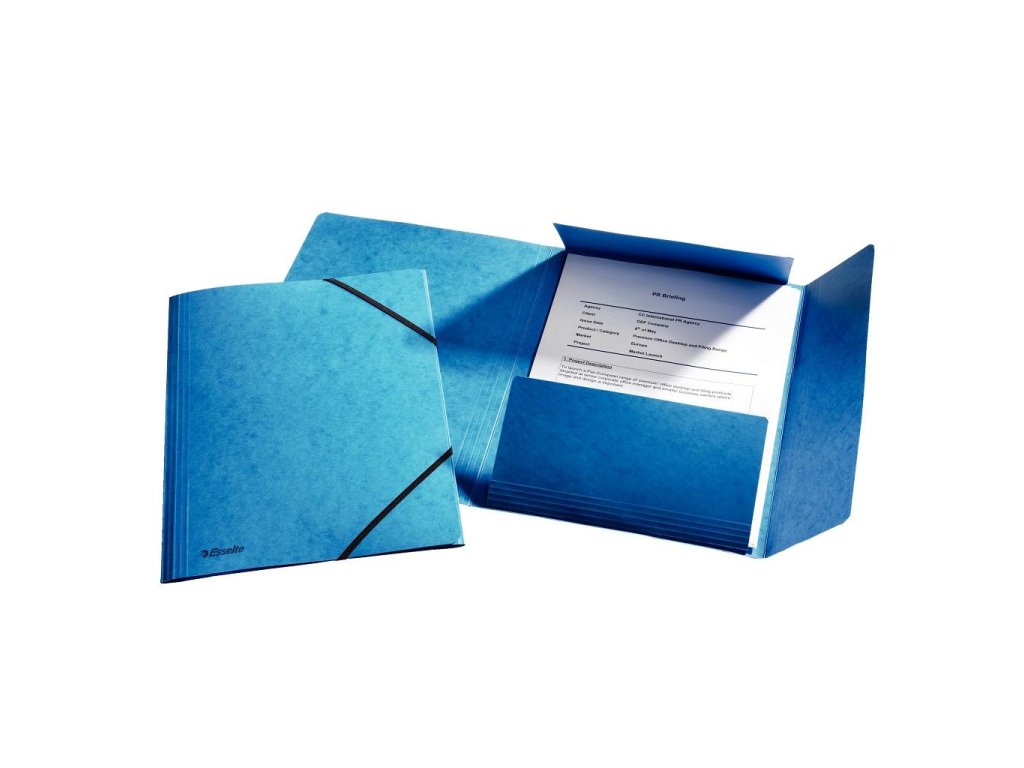Obal A4 s tromi chlopňami a čiernou gumičkou. Materiál na dotyk príjemný prešpán. Prelisy na chlopniach a chrbte zvyšujú kapacitu obalu. Väčšie balenie 10 ks.Farba: modrá