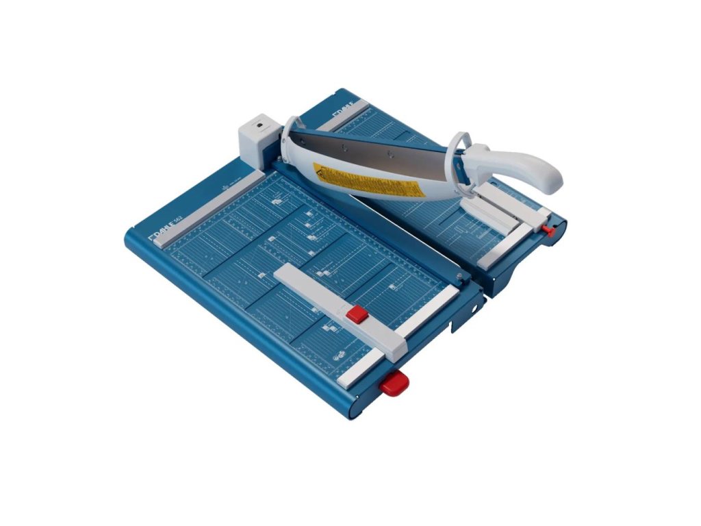 Protišmiková, robustná a presná páková rezačka s kovovou základňou a automatickým prítlakom. Brúsený vrchný a spodný nôž z kvalitnej nožiarskej ocele Solingen, rotujúci kryt okolo ostria. Presná mierka v cm/ inch a DIN formátoch. Výrez na spodnej časti na pohodlné prenášanie. Veľkosť stola 460 × 490 mm. Komfortná výbava s podporným predným stolom a zariadením na rezanie tenkých prúžkov a laserovým lúčom, indikujúcim reznú líniu.Pohodlná práca vďaka ergonomickej rukoväti optimalizovanej pre prenos sily zhora. Automatické, odnímateľné upnutie pre väčšie pohodlie pri rezaní materiálov citlivých na tlak.