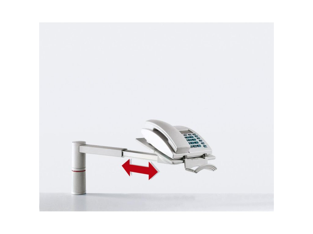 Otočný nosič telefónu s ľahko vysúvateľným ramenom a otáčacou základňou. Výška nad pracovným stolom 10 - 15 cm, nosnosť 2 kg. Dĺžka ramena 22 cm. Dodávaný v štandardnej verzii na hrúbku stola 1,8 až 7,4 cm. Farba sivá.Farba: sivá