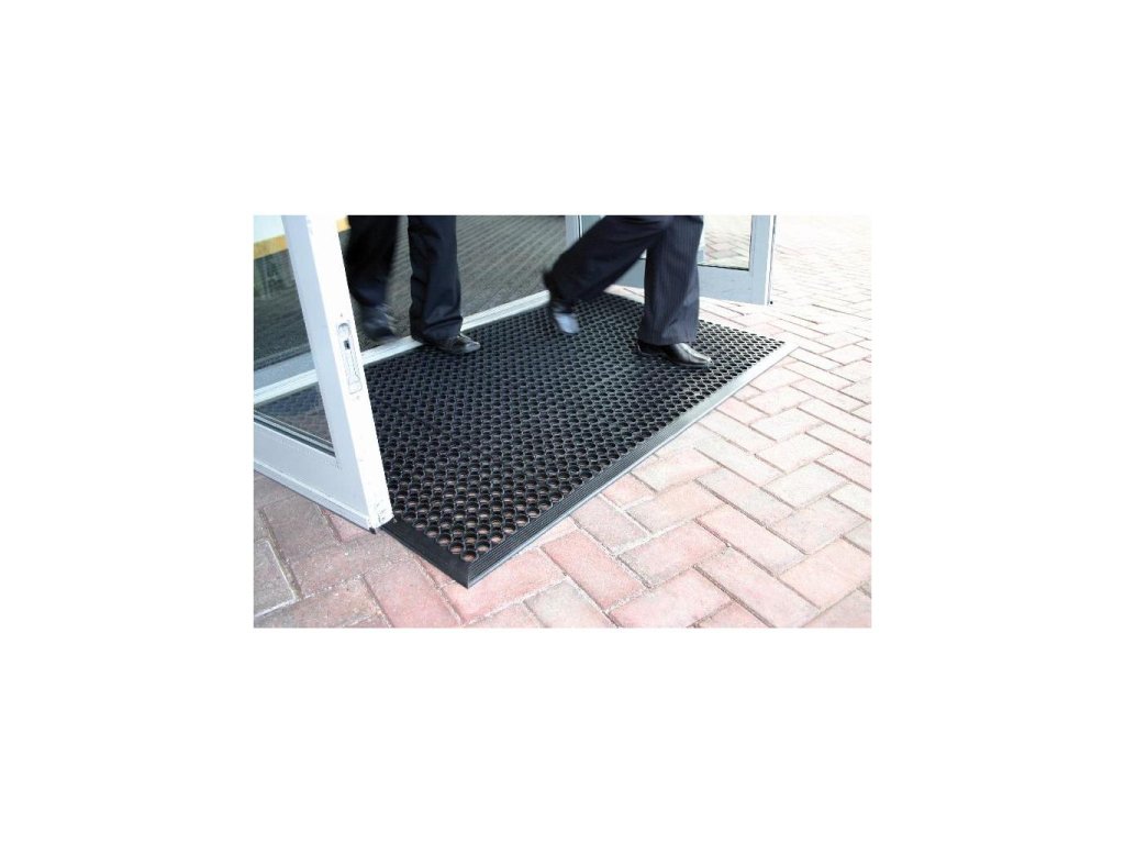 Protiúnavová exteriérová rohož vyrobená z oteruvzdornej pryže. Zvýšený kruhový povrch s otvormi poskytuje vynikajúcu protišmykovú ochranu, skosená hrana znižuje riziko zakopnutia. Výška rohože 14 mm. Rohož vyhovuje slovenským normám a nariadeniam.Rozmery: 90x150 cm