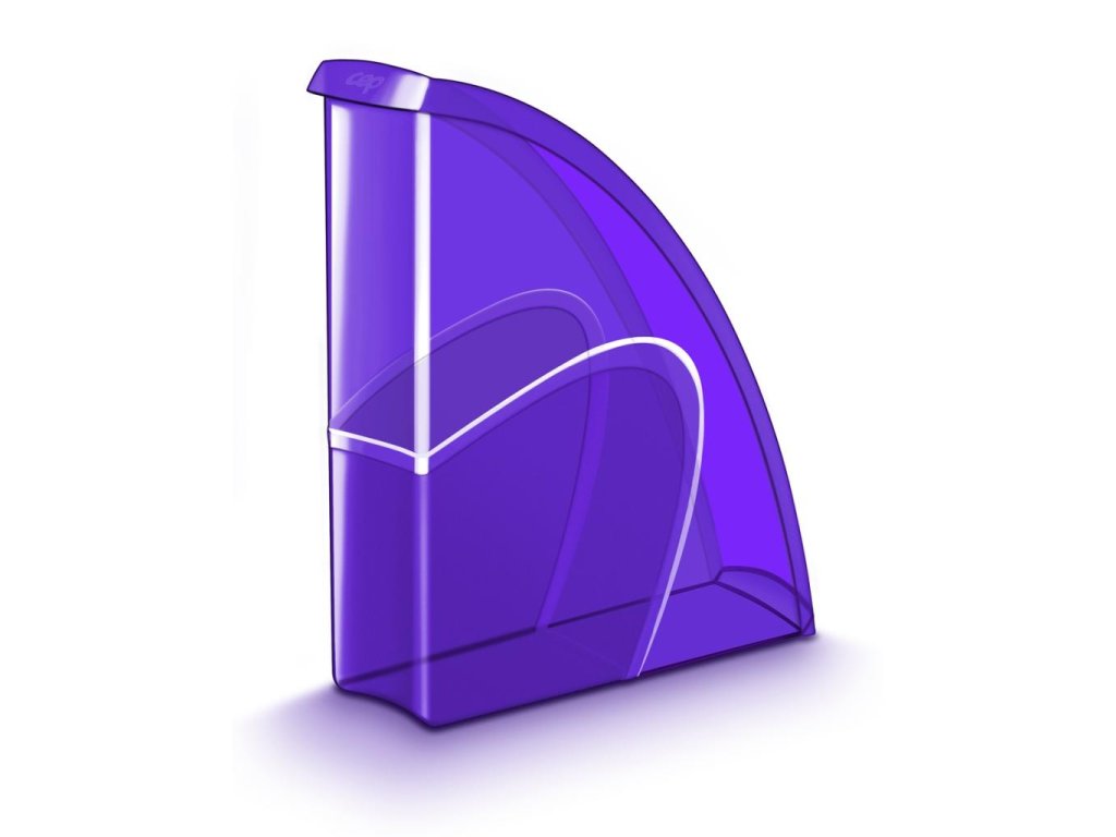 Stojan na časopisy s možnosťou vertikálneho alebo horizontálneho postavenia má elegantné línie, zvýraznené materiálom s kontrastným matným povrchom na hladkom pozadí. Vhodný na dokumenty do veľkosti 24 × 32 cm. Kapacita 700 listov (80 g / m²), rozmery 270 × 85 × 310 mm. Materiál 100% recyklovateľný vysokokvalitný plast. Väčšie balenie 10 ks. Farba transparentná fialová.Dodatočné parametre
