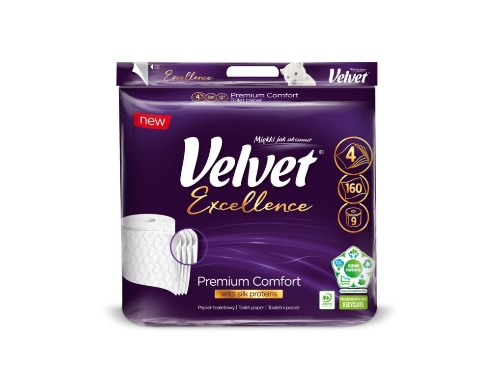 Toaletný papier Velvet Excellence sú veľké, ideálne navinuté rolky pevného papiera, ktorý sa skladá zo štyroch vrstiev mäkkého, jemného papiera. Jeho pevné, silné a snehovo biele útržky, ozdobené estetickým vzorom razby, to nie je len pohodlie a maximálny užívateľský komfort, ale aj jednoduchosť a minimalizmus, vhodné na vybavenie každej toalety. Toaletný papier navyše obsahuje tzv. „hodvábny proteín“, čo je ľahká bielkovina, z ktorej sa skladajú hodvábne nite. Vďaka príbuznosti s bielkovinou ľudskej kože - keratínom - sa hodvábny proteín dobre uchytáva na povrchu pokožky a tvorí tak zvláčňujúcu ochrannú bariéru, ktorá skvele zadržuje vlhkosť a chráni pred vplyvmi vonkajšieho prostredia. 9 roliek, 4 vrstvy, návin 20 m, 100% celulózaDodatočné parametre