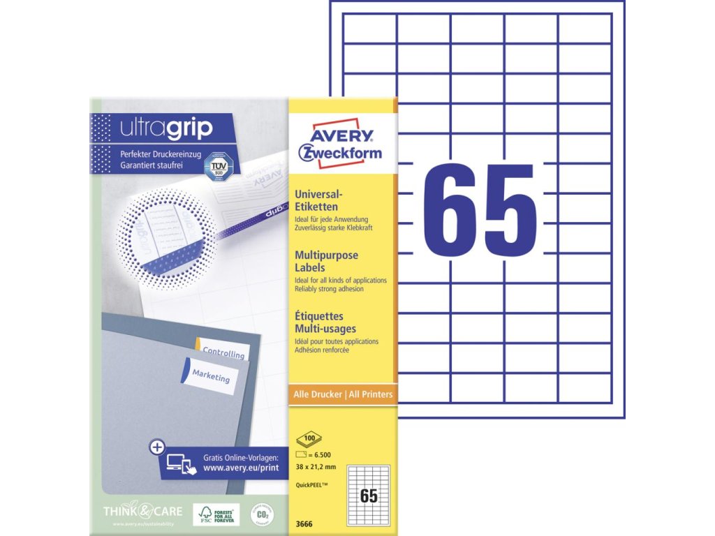 Biele univerzálne etikety vhodné na každodenné použitie v atramentových a laserových tlačiarňach a kopírovacích strojoch. Vďaka inovatívnej technológie ultragrip sa môžete spoľahnúť na bezchybné natiahnutie archu a tlač bez zasekávania. Bezpečnostný okraj QCT zabraňuje zanášaniu tlačiarne lepidlom. Pre laserové tlačiarne testované a certifi kované TÜV SÜD. Vysoká lepivosť na rôznych povrchoch. Ostrá tlač bez bez rozmazávania. Etikety sú vyrobené spôsobom šetrným k životnému prostrediu, majú certifi káciu FSC®, sú bielené bez použitia chlóru. Šablóny a softvér pre jednoduchú a rýchlu tlač etikiet k dispozícii zdarma. U niektorých rozmerov systém QuickPEEL™ na rýchlejšie odlepenie etikiet. Formát A4. Balenie 100 hárkov. Farba biela.Dodatočné parametre