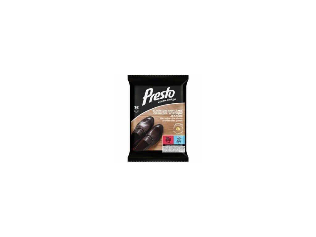 PRESTO CLEAN - VLHČENÉ OBRÚSKY NA TMAVÚ OBUV 15 KS. Presto Clean vlhčené utierky na tmavé topánky sú praktickým riešením na rýchle a efektívne čistenie a ošetrovanie bielych topánok, ktoré sú náchylné na špinu a škvrny. Tieto špeciálne navrhnuté utierky okamžite odstraňujú nečistoty, prach a škvrny z povrchu topánok, čím udržiavajú ich pôvodnú farbu a čistý vzhľad. Vďaka svojmu zloženiu Presto Clean utierky šetrne čistia rôzne materiály, vrátane kože, syntetických materiálov a textílií, bez toho, aby zanechávali škvrny alebo stopy. Sú ideálnym pomocníkom na rýchle čistenie v teréne alebo doma, a zároveň zanechávajú topánky svieže a žiarivé. Ich kompaktné balenie je vhodné na cesty, takže si môžete svoje biele topánky udržiavať čisté kdekoľvek a kedykoľvek. Hlavné vlastnosti: Efektívne odstraňujú prach, špinu a škvrny. Vhodné na biele kožené, syntetické a textilné topánky. Nezanechávajú šmuhy ani stopy Jednoduché použitie - ideálne na cesty alebo rýchle čistenie.Dodatočné parametre