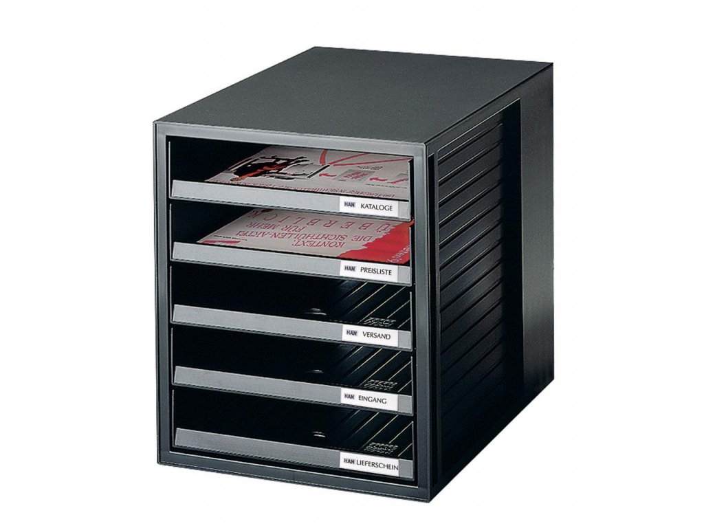Plastový zásuvkový box s piatimi otvorenými zásuvkami. Zmestí sa do ľubovoľnej police určenej pre zakladače, pretože výška boxu je totožná s výškou pákových zakladačov (275 × 330 × 320 mm).Farba boxu/zásuvky: čierna/čierna