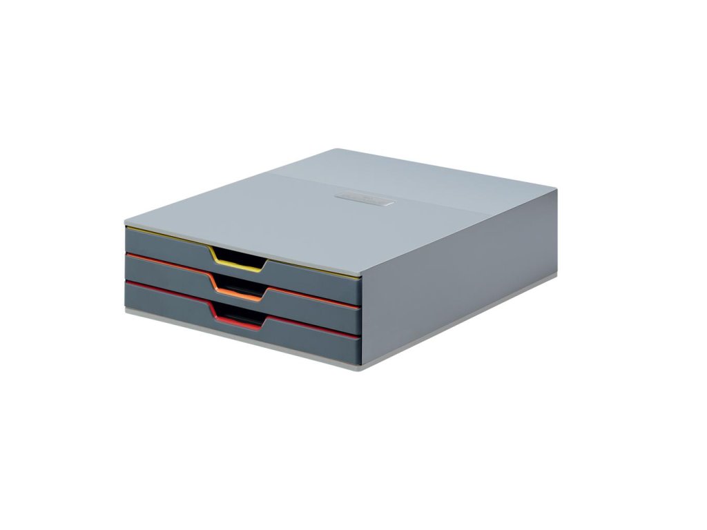 Boxy s 3 zásuvkami s vnútrami dúhových farieb dodajú kancelárii nádych elegancie. Pri ich zatvorení farebné línie iba jemne vystupujú z elegantnej sivej farby, pri otvorení sú žiarivé farby dúhy potešením pre oči. Dodávané s priehľadnými plastovými indexami na označenie obsahu. Boxy sú stohovateľné, zásuvky zabezpečené proti vypadnutiu. Materiál najkvalitnejší ABS plast, tichý a ľahký posun zásuviek, spodná strana s protišmykovou ochranou. Víťaz Product design award 2013. Rozmery (š × v × h) 95 × 280 × 356 mm.Dodatočné parametre